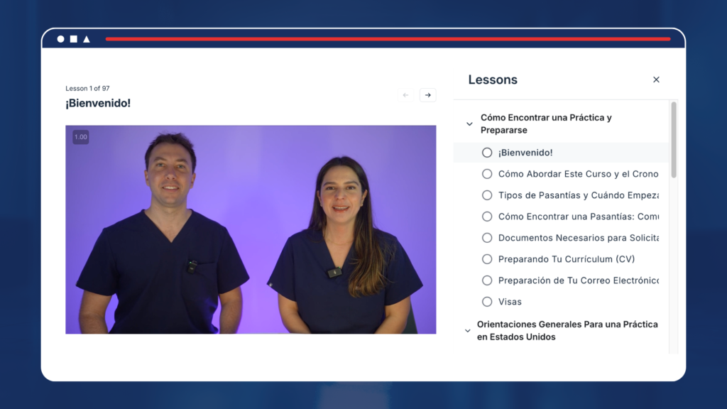 En esta clase exclusiva recibirás un mapa que te mostrará desde los primeros pasos para aprender el inglés médico realmente usado en hospitales internacionales, hasta los detalles finales para conseguir y aprovechar al máximo una experiencia en Estados Unidos.